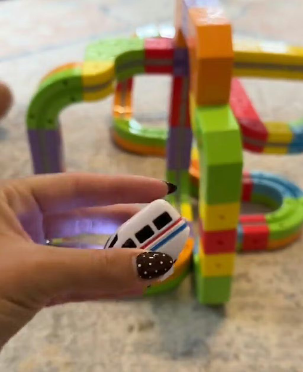 • Végre egy játék, ami nem zajos. A kisfiam hosszú percekig csak nézi, ahogy halad a vonat. Meglepően megnyugtató.