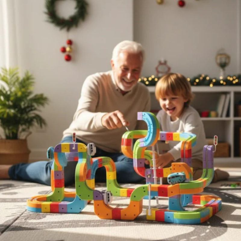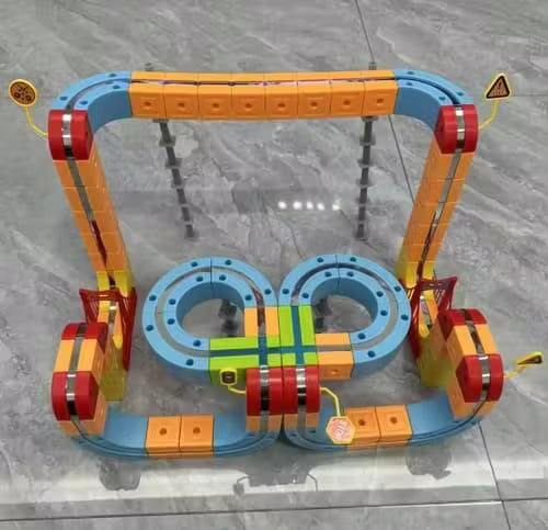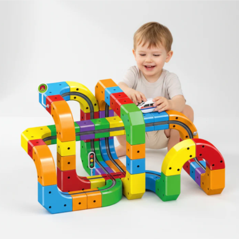 Az elemek könnyedén kapcsolódnak egymáshoz, így a pálya újra és újra átrendezhető. Egyenes szakaszok, kanyarok és különböző elemek találkoznak, hogy minden összeállítás más hangulatot és élményt adjon.